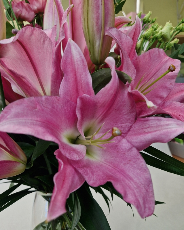 This vase is the perfect choice for someone who loves scented oriental lilies. These stunning pink lilies are arranged in an elegant glass vase with pink lisianthus, eucalyptus and palm leaves. For maximum enjoyment the lilies will be delivered in bud. To make this vase even more special we can add pink roses, just select the larger option.