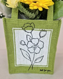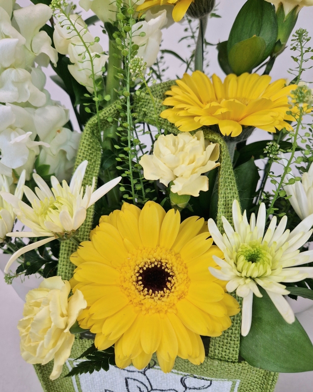 This cut jute gift bag is filled with bright flowers and is just like a sunny day! Carefully created by one of our florists using germini snapdragons, carnations and chrysanths. This is a low maintenance gift it will just need a drop of water.