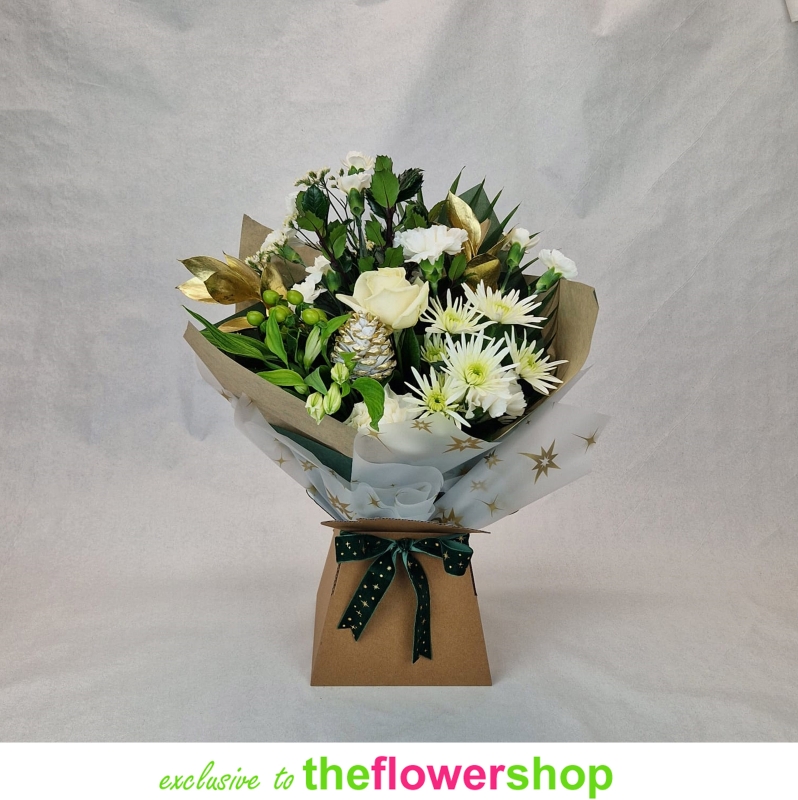 This elegant gift box will be created in warm white, green and gold a classy combination for Christmas. Your gift will be delivered in water.
