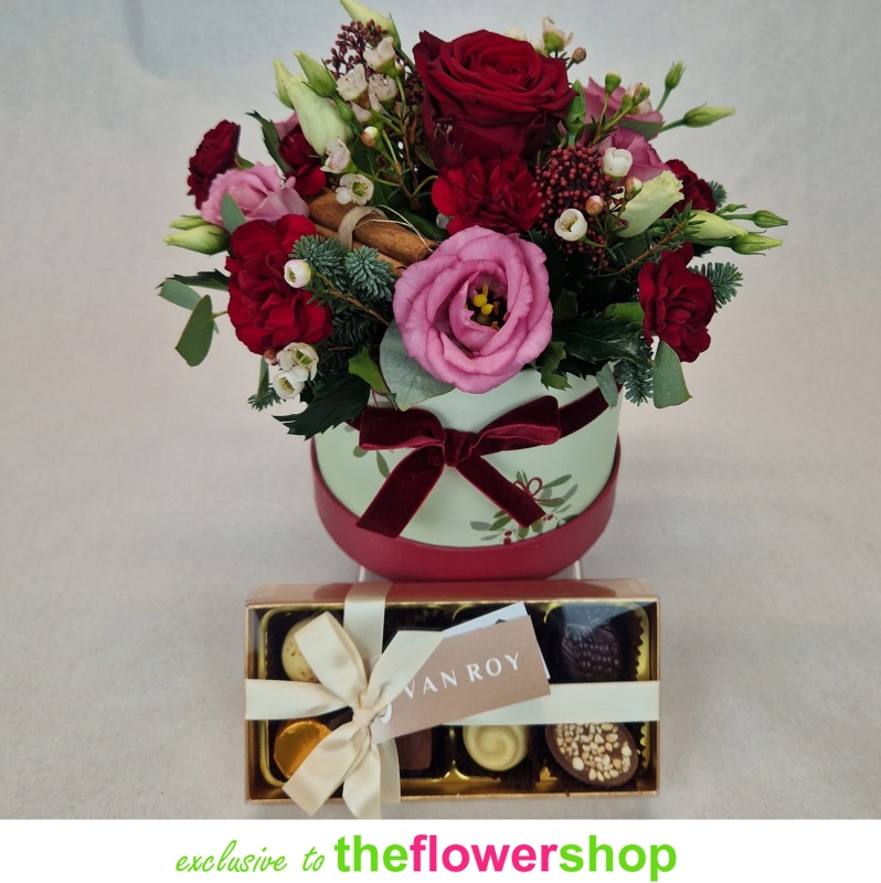 This cute little Hat Box contains a pretty selection of flowers including a luxury red rose.  It is accompanied by a box of delicious Belgium Chocolates.