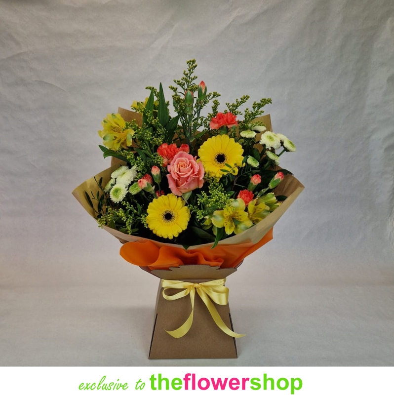 This Gift Box is glowing with bright yellows and oranges, it includes germini, santini, alstroemeria and a beautiful peach rose.  One of our florist team will arrange them into a gift box , your flowers will be delivered in water.